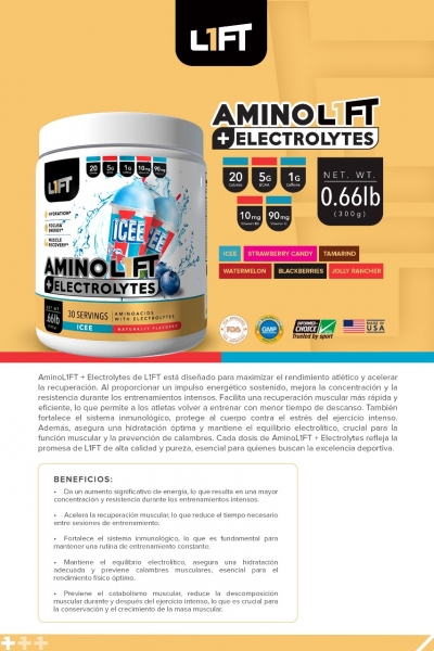 AminoL1FT + Electrolytes de L1FT está diseñado para maximizar el rendimiento atlético y acelerar la recuperación. Al proporcionar un impulso energético sostenido, mejora la concentración y la resistencia durante los entrenamientos intensos. Facilita una recuperación muscular más rápida y eficiente, lo que permite a los atletas volver a entrenar con menor tiempo de descanso. También fortalece el sistema inmunológico, protege al cuerpo contra el estrés del ejercicio intenso. Además, asegura una hidratación óptima y mantiene el equilibrio electrolítico, crucial para la función muscular y la prevención de calambres. Cada dosis de AminoL1FT + Electrolytes refleja la promesa de L1FT de alta calidad y pureza, esencial para quienes buscan la excelencia deportiva.