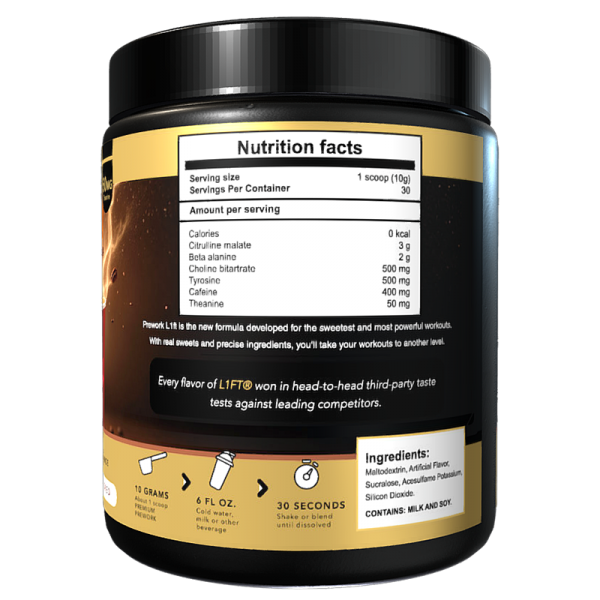 Descubre Prework de L1FT, el suplemento de élite que elevará tu rendimiento atlético a nuevas alturas. Fabricado con meticulosa precisión en los Estados Unidos, este producto insuperable fue diseñado para atletas dedicados que solo buscan lo mejor. Con Prework Premium, experimentarás un aumento de energía explosiva, una concentración mental impecable y una resistencia física mejorada. Gracias a su formulación científica avanzada, disfrutarás de resultados reales y tangibles. Prepárate para optimizar el flujo sanguíneo, retrasar la fatiga y potenciar tu fuerza muscular. Elige Prework de L1FT y alcanza la excelencia en cada entrenamiento.