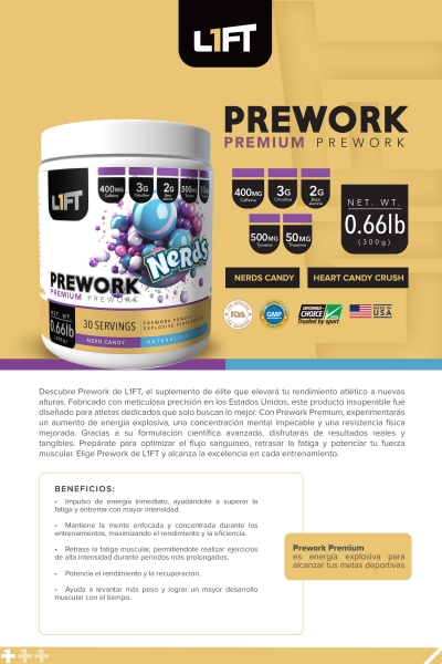 Descubre Prework de L1FT, el suplemento de élite que elevará tu rendimiento atlético a nuevas alturas. Fabricado con meticulosa precisión en los Estados Unidos, este producto insuperable fue diseñado para atletas dedicados que solo buscan lo mejor. Con Prework Premium, experimentarás un aumento de energía explosiva, una concentración mental impecable y una resistencia física mejorada. Gracias a su formulación científica avanzada, disfrutarás de resultados reales y tangibles. Prepárate para optimizar el flujo sanguíneo, retrasar la fatiga y potenciar tu fuerza muscular. Elige Prework de L1FT y alcanza la excelencia en cada entrenamiento.